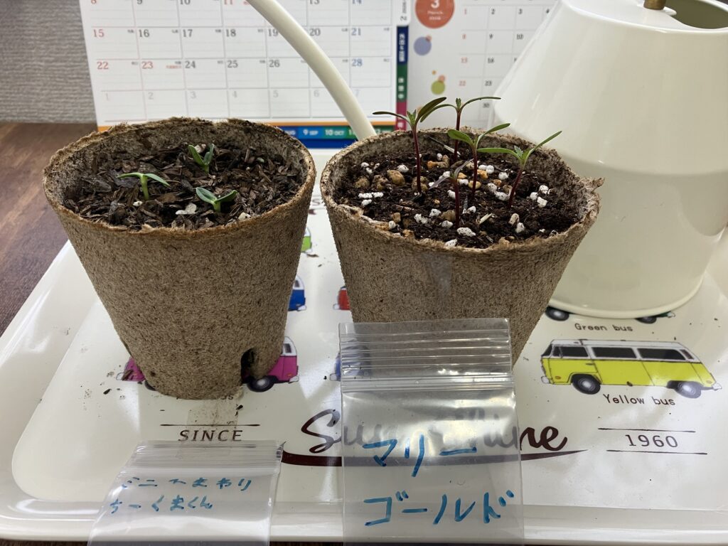 前回マリーゴールドの方は芽が出てきたことをお伝えしていたのですが、ついにミニひまわりの方にも芽が出てきました〜✨